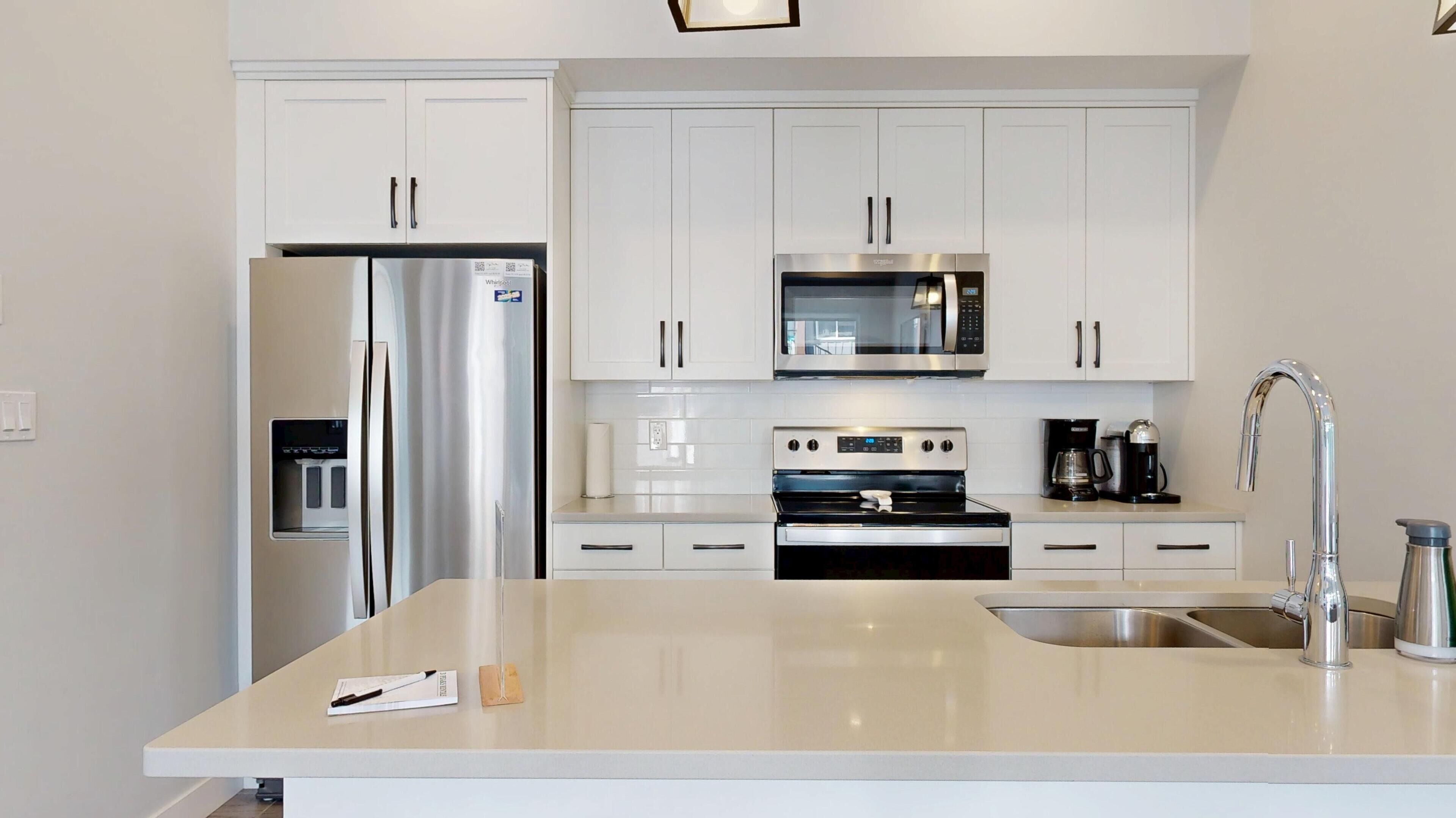 This unit boasts a beautiful open concept main floor, perfect for gathering together, with ample natural light pouring in the expansive windows. The spacious kitchen comes equipped with all cookware and dishware essentials and is completed by a lovely breakfast bar to seat 3. Behind the breakfast bar you will find a large dining table to seat 6 and next to the dining space is a beautiful living room with tall cielings, a flat screen tv, a gas fireplace and seating for 6. The open concept kitchen, living and dining space is completed with a balcony off the front of the home, big enough for the whole family to spend time out there.