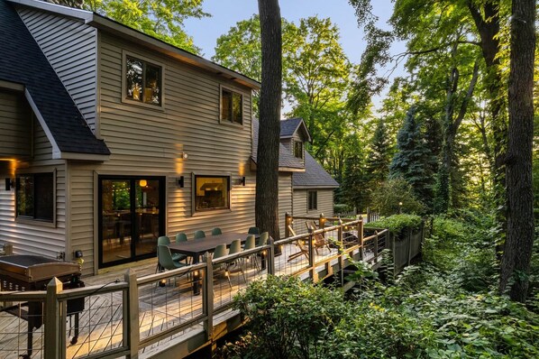 Sliding glass doors lead to back deck with outdoor dining table for 10