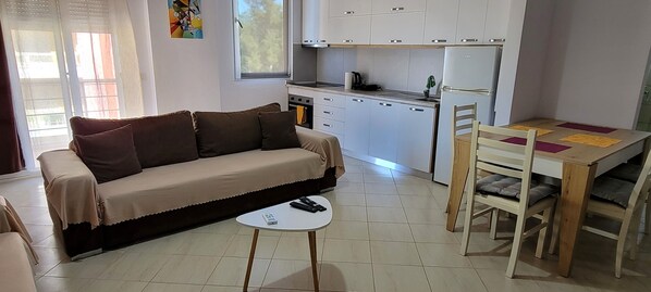 Enjoy a relaxing stay in this bright and comfortable apartment with a stunning sea view. The apartment features one cozy bedroom and a spacious living room, making it perfect for up to 4 guests. The bedroom offers a comfortable bed, while the living room includes 2 sofa bed, ideal for additional guests. The apartment is fully equipped with all modern amenities, including air conditioning, free Wi-Fi, a fully equipped kitchen, and a private bathroom. Step out onto the balcony and take in the breathtaking sea views, perfect for morning coffee or evening relaxation. Located in a convenient area, the apartment provides easy access to the beach, restaurants, and local attractions. Perfect for couples, families, or small groups looking for a comfortable and relaxing seaside stay.