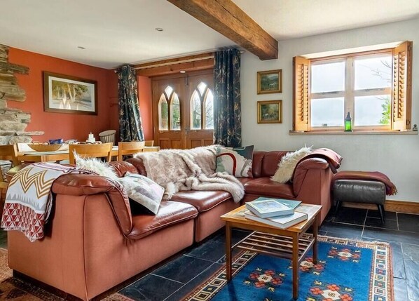 Living Room & Dining - Cosy living space with wood burning stove and plenty comfortable seating, including a flat screen smart TV.