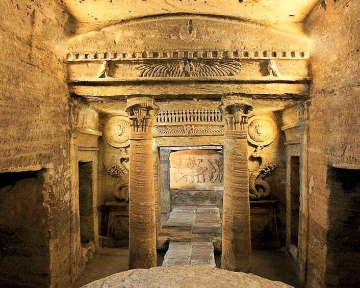 Tras ser recogido en tu hotel, viajarás a Alejandría. Comienza tu viaje adentrándote en las profundidades de la historia en las Catacumbas de Kom El Shoqafa, una necrópolis subterránea que ha intrigado a historiadores y exploradores por igual. Here, a breathtaking Masterpiece Tomb, a stunning testament to the mixture of Egyptian, Greek, and Roman artistry. Se descubrieron accidentalmente cuando un burro desapareció por el suelo, desvelando uno de los yacimientos arqueológicos más notables de Alejandría.