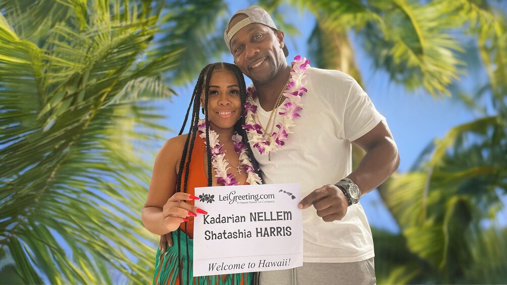 Dos leis de orquídeas clásicas a juego, un cálido saludo aloha en la puerta de llegada, acompañamiento a la recogida de equipajes o al vuelo de conexión entre islas.