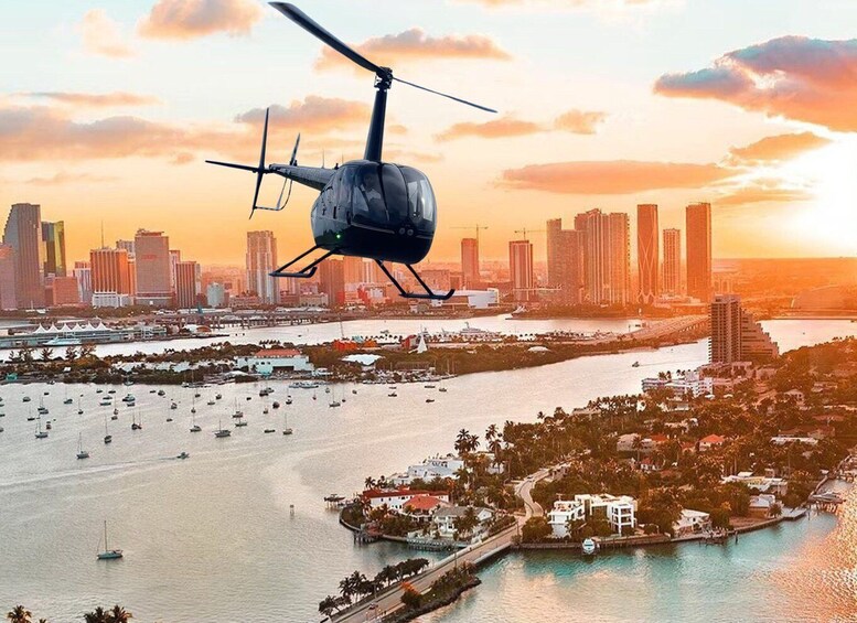Sortiu de l'aeroport executiu de Miami i embarqueu-vos en una excursió amb helicòpter encantadora, programada per coincidir amb les tonalitats màgiques de la posta de sol. Comenceu el vostre viatge per les costes verdes i arbrades de Coconut Grove, on l'esperit bohemi de la ciutat es fusiona amb la tranquil·litat de la natura sota un cel brillant.