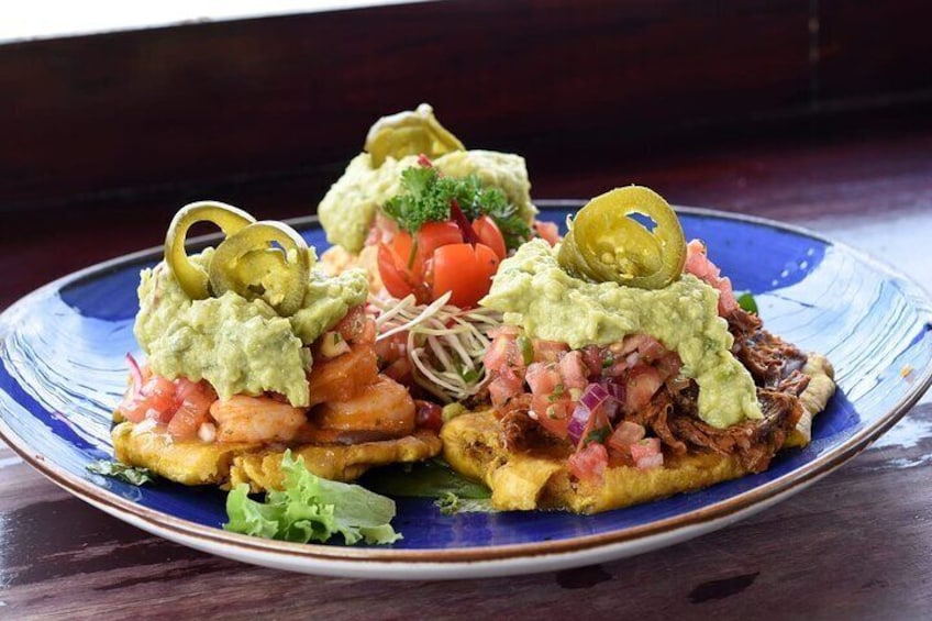 Restaurante Parada 2: Bar tradicional tico Duración: 30-45 minutos Detalles: Dirígete a un bar tradicional tico, donde saborearás patacones cubiertos con tu elección de pollo, camarones o carne de res. Estos discos de plátano fritos dos veces son crujientes y sabrosos. Para completar la experiencia, tómate un trago de chile guaro, un licor picante costarricense, y escucha sobre su importancia en las festividades y celebraciones locales.