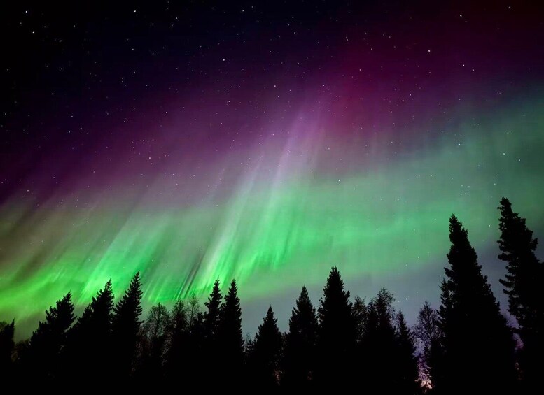 Únete a esta cacería de auroras en una excursión guiada por Rovaniemi. Te recogemos y conducimos hasta las afueras de la ciudad, hacia el Norte, donde pasaremos por la Aldea de Papá Noel y el Círculo Polar Ártico.